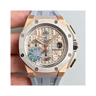 Size: 44 mm Movement: SWISS Audemars Piguet 3126 Automatic Movement 28800bph, SECONDS Running at 12@ Functions: Hours, Minutes, Seconds, Date and Chronograph with SECONDS Running at 12@ Like Genuine Case: 18K Rose Gold Dial: Gray Dial with Rose Gold Markers Bezel: Titanium Bezel Crystal: Scratch-proof sapphire crystal with AR coating Strap: Gray Leather Strap and Gray Rubber Strap Clasp: Deployment Clasp Water resistance: 50 Meters
