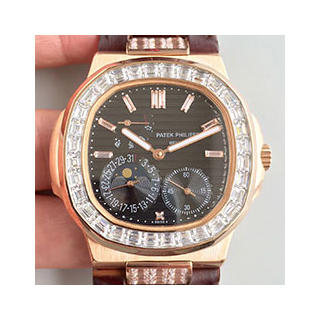 Size: 40 mm Movement: SWISS Patek Philippe 240 PS IRM C LU Automatic Movement Like Genuine Functions: Hours, Minutes, Seconds, Date, Moonphase and Power Reserve Case: 18K Rose Gold Dial: Black Dial Bezel: Diamond Bezel with Diamond Markers Crystal: Scratch-proof sapphire crystal with AR coating Strap: Brown Leather Strap Clasp: Deployment Clasp Water resistance: 40 Meters